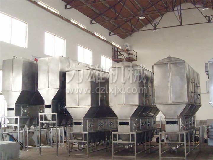 潔凈的熱風經閥板分配進入床體內,從加料器進入的濕物料被熱風形成沸騰狀態。由于熱風與物料廣泛接觸,增強了傳熱傳質的過程,因此在較短時間內就可干燥。如用連續型,物料從床體的一頭進入,經過幾十秒至幾分鐘沸騰干燥,自動從床體另一頭流出。本設備一般進行負壓操作。